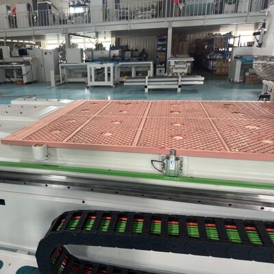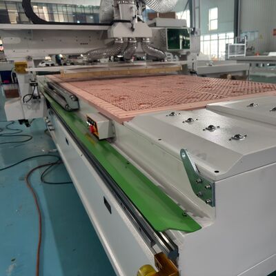 The 1330A Linear Tool Changer + Press Roller Machining Center is a high-performance CNC processing machine that integrates door panel processing and cabinet body machining capabilities. Equipped with a high-power 9kW automatic tool-changing spindle supporting speeds from 18,000 to 24,000 rpm, it features a linear 12-tool magazine to meet fast tool change requirements for complex processes. The machine has overall dimensions of 4300×2000×2100mm and a maximum processing capacity of 3050×1220×18mm, with rapid traverse speeds of 60m/min and working speeds of 20m/min. It includes a zoned vacuum adsorption table and a patented dual-press roller system to ensure board flatness and machining accuracy. Controlled by a Taiwanese LNC CNC system and paired with servo drives and high-precision transmission components, it is suitable for efficient and precise processing in custom furniture, panel furniture, and decorative building materials.