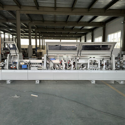 The edge banding machine performs all operations in one pass: gluing, pressing, rough trimming, end trimming, corner trimming, vacuuming, secondary scraping, and buffing.